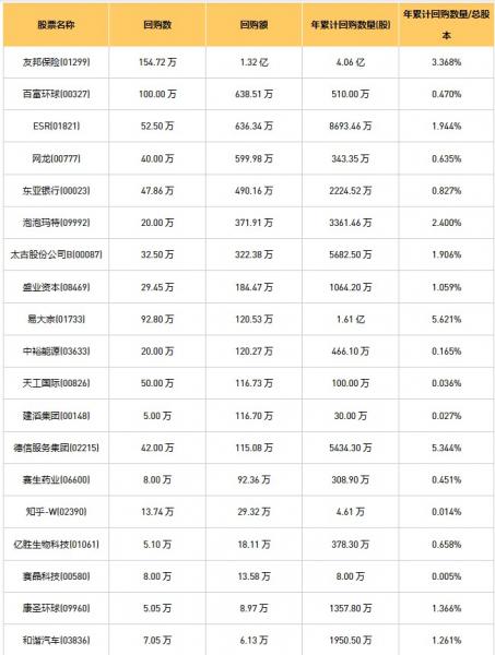 和谐汽车(03836)、亿胜生物科技(01061)、泡泡玛特(09992)、东亚银行(00023)、天工国际(00826)、建滔集团(00148)、德信服务集团(02215)、太古股份公司B(00087)、赛晶科技(00580)、中裕能源(03633)、百富环球(00327)、盛业资本(08469)、友邦保险(01299)、摩比发展(00947)、乐声电子(00213)、易大宗(01733)、天福(06868)、赛生药业(06600)、网龙(00777)、康圣环球(09960)、ESR(01821)、知乎-W(02390)于2023年4月27日进行了回购。其中,回购金额最大的为友邦保险(01299),回购数量154.72 万,回购金额1.32 亿元。