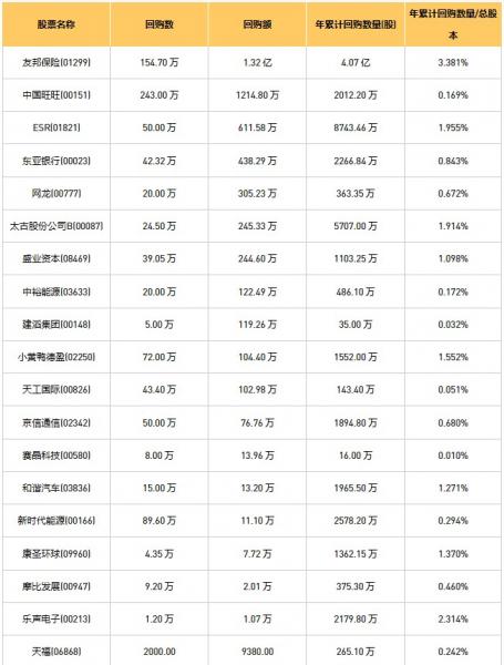 和谐汽车(03836)、小黄鸭德盈(02250)、摩比发展(00947)、新时代能源(00166)、东亚银行(00023)、天福(06868)、中裕能源(03633)、建滔集团(00148)、京信通信(02342)、乐声电子(00213)、网龙(00777)、太古股份公司B(00087)、友邦保险(01299)、中国旺旺(00151)、天工国际(00826)、盛业资本(08469)、赛晶科技(00580)、ESR(01821)、康圣环球(09960)于2023年4月28日进行了回购。其中,回购金额最大的为友邦保险(01299),回购数量154.70 万,回购金额1.32 亿元。