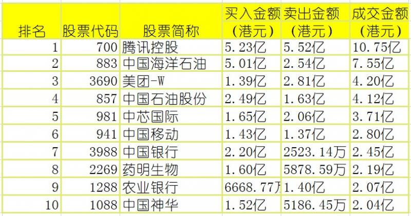 港股通(深)买卖前十股(单位:港元):