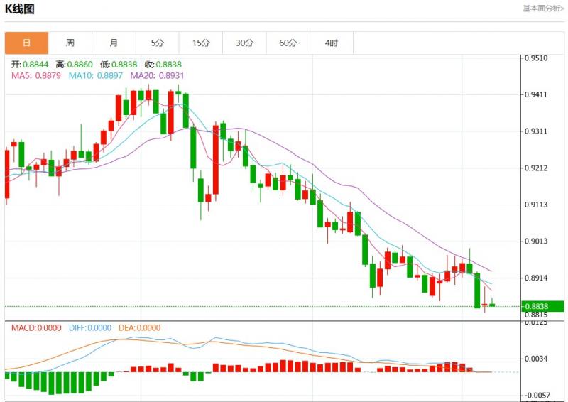 周五盘中,美元瑞郎报0.8839,跌幅0.06%。