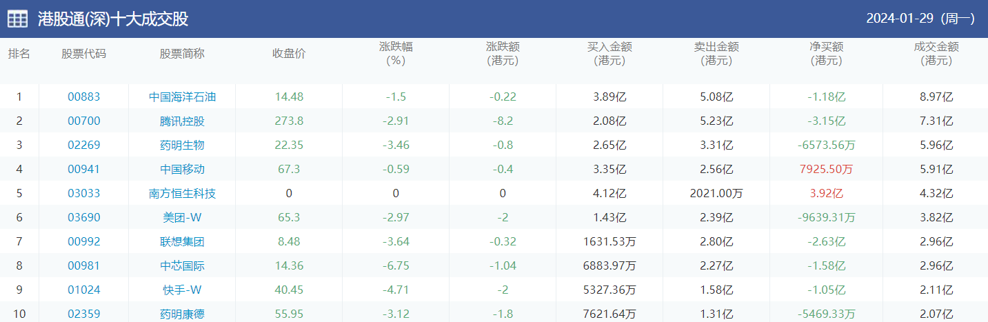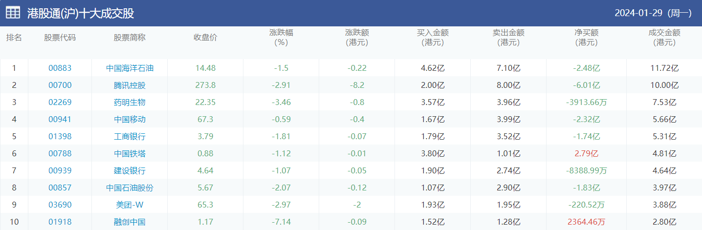 亚汇网实时数据统计:截至1月30日收盘中国海洋石油、腾讯控股、药明生物位居港股通(沪)成交前三,中国海洋石油、腾讯控股、药明生物位居股通(深)成交前三。