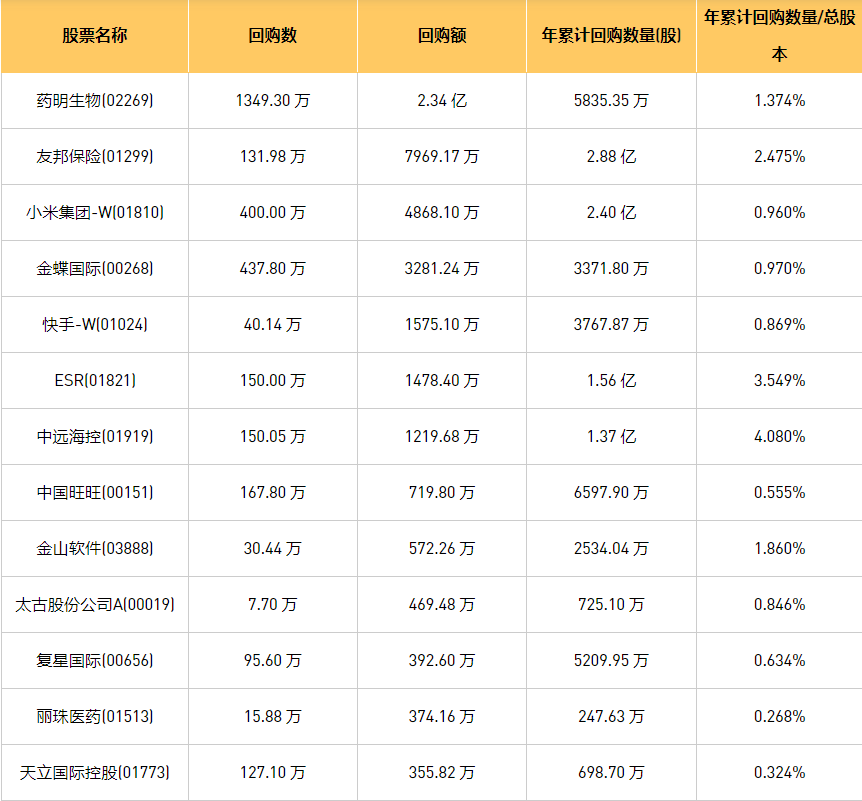 2月6日港股回购概况:金蝶国际(00268)、理文造纸(02314)、中远海控(0)、上海石油化工股份(00338)、中国旺旺(00151)、清科创业(01945)、诺诚健华(09969)、阜丰集团(00546)、祖龙娱乐(09990)、歌礼制药-B(01672)、美因基因(06667)、复星国际(00656)、丽珠医药(01513)、立基工程控股(01690)、天鸽互动(01980)、明源云(00909)、乐声电子(00213)、首程控股(00697)、微泰医疗-B(02235)、友邦保险(01299)、太古股份公司A(00019)、中国旭阳集团(01907)、金山软件(03888)、方达控股(01521)、汇量科技(01860)、ESR(01821)、瑞尔集团(06639)、太古股份公司B(00087)、小米集团-W(01810)、天立国际控股(01773)、快手-W(01024)、药明生物(02269)于2024年2月5日进行了回购。其中,回购金额最大的为药明生物(02269),回购数量1349.30 万,回购金额2.34 亿元。