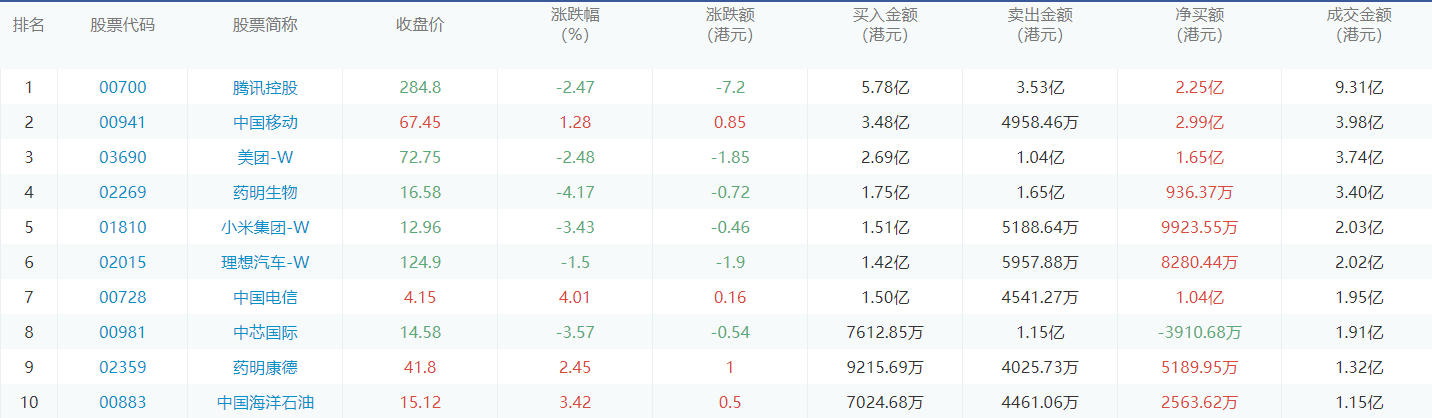 今日港股通数据一览:腾讯控股净买入额居首额(2024/2/19)