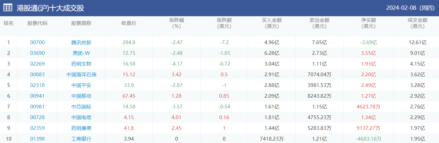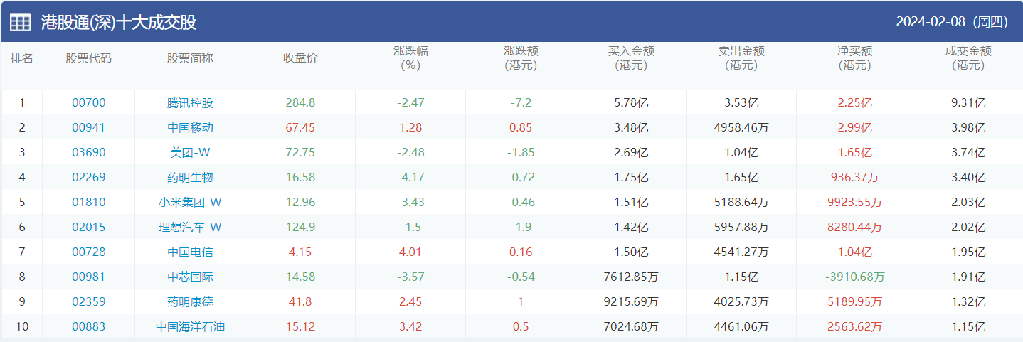 今日南向资金买卖十大成交榜(2024/2/19)