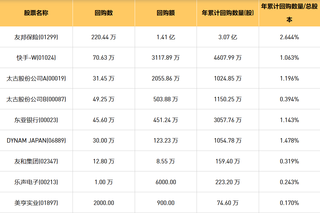 3月1日港股回购概况:DYNAM JAPAN(06889)、东亚银行(00023)、友和集团(02347)、美亨实业(01897)、友邦保险(01299)、乐声电子(00213)、快手-W(01024)、太古股份公司A(00019)、太古股份公司B(00087)于2024年2月29日进行了回购。其中,回购金额最大的为友邦保险(01299),回购数量220.44 万,回购金额1.41 亿元。