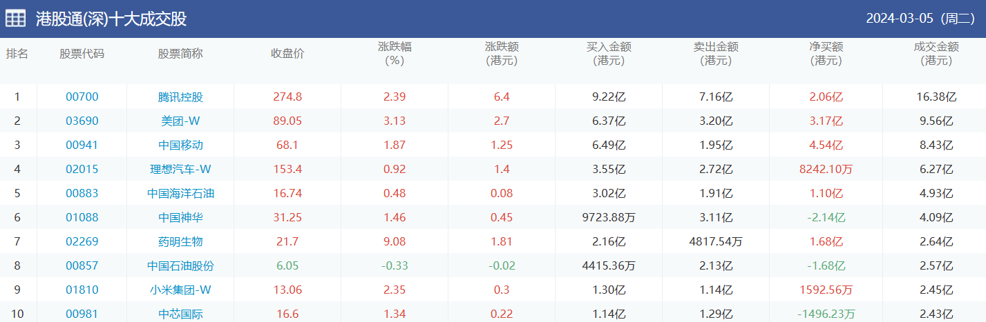 亚汇网实时数据统计:截至3月6日收盘腾讯控股、美团-w、中国移动位居港股通(沪)成交前三,腾讯控股、美团-w、中国移动位居股通(深)成交前三。