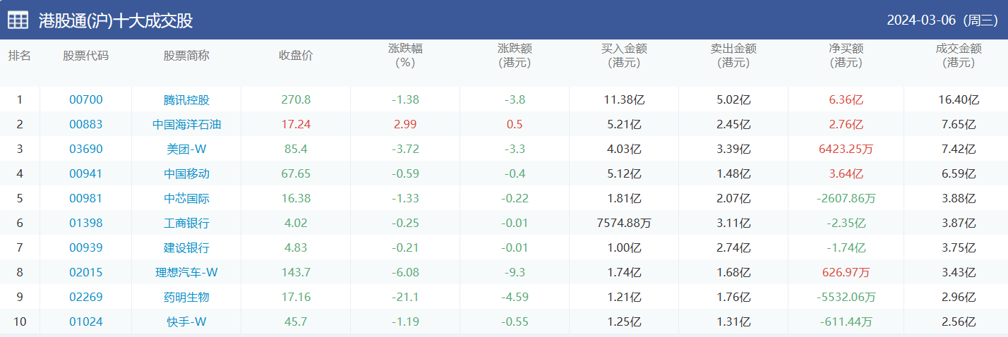 亚汇网实时数据统计:截至3月7日收盘腾讯控股、中国海洋石油、美团-w位居港股通(沪)成交前三,腾讯控股、中国移动、理想汽车-w位居股通(深)成交前三。