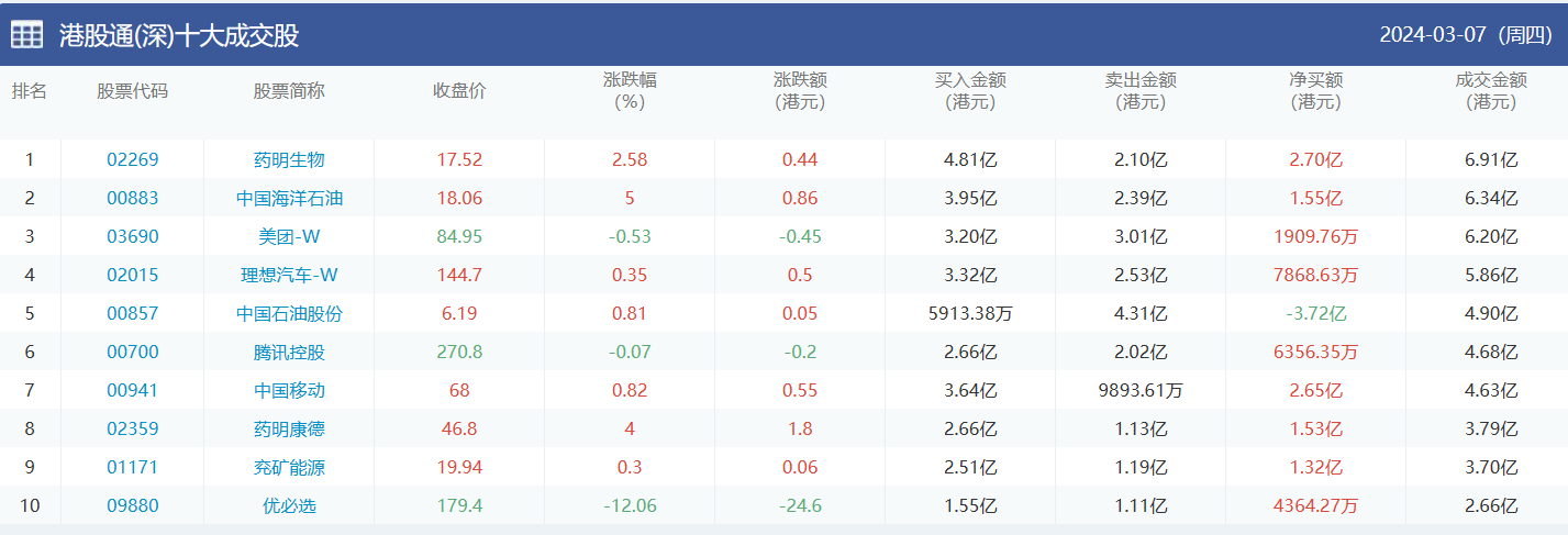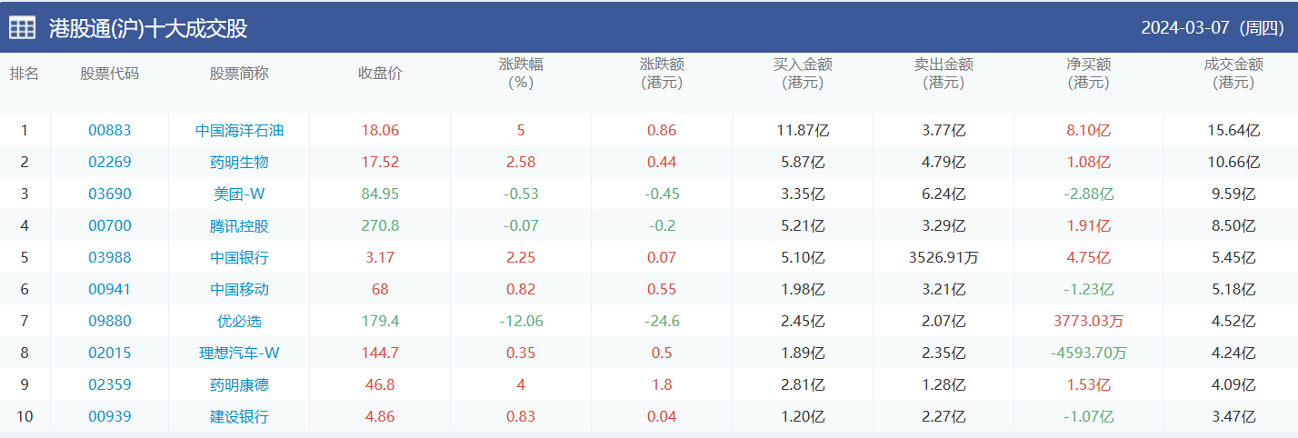 亚汇网实时数据统计:截至3月8日收盘中国海洋石油、药明生物、美团-w位居港股通(沪)成交前三,药明生物、中国海洋石油、美团-w位居股通(深)成交前三。