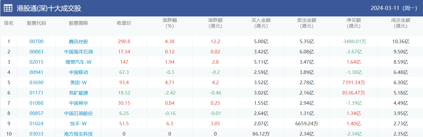 亚汇网实时数据统计:截至3月12日收盘中国海洋石油、腾讯控股、中国移动位居港股通(沪)成交前三,腾讯控股、中国海洋石油、理想汽车-w位居股通(深)成交前三。