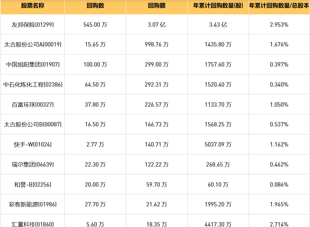 3月21日港股回购概况:科联系统(00046)、友邦保险(01299)、太古股份公司A(00019)、天福(06868)、百富环球(00327)、彩客新能源(01986)、美亨实业(01897)、瑞尔集团(06639)、汇量科技(01860)、太古股份公司B(00087)、中国旭阳集团(01907)、中石化炼化工程(02386)、快手-W(01024)、和誉-B(02256)于2024年3月20日进行了回购。其中,回购金额最大的为友邦保险(01299),回购数量545.00 万,回购金额3.07 亿元。