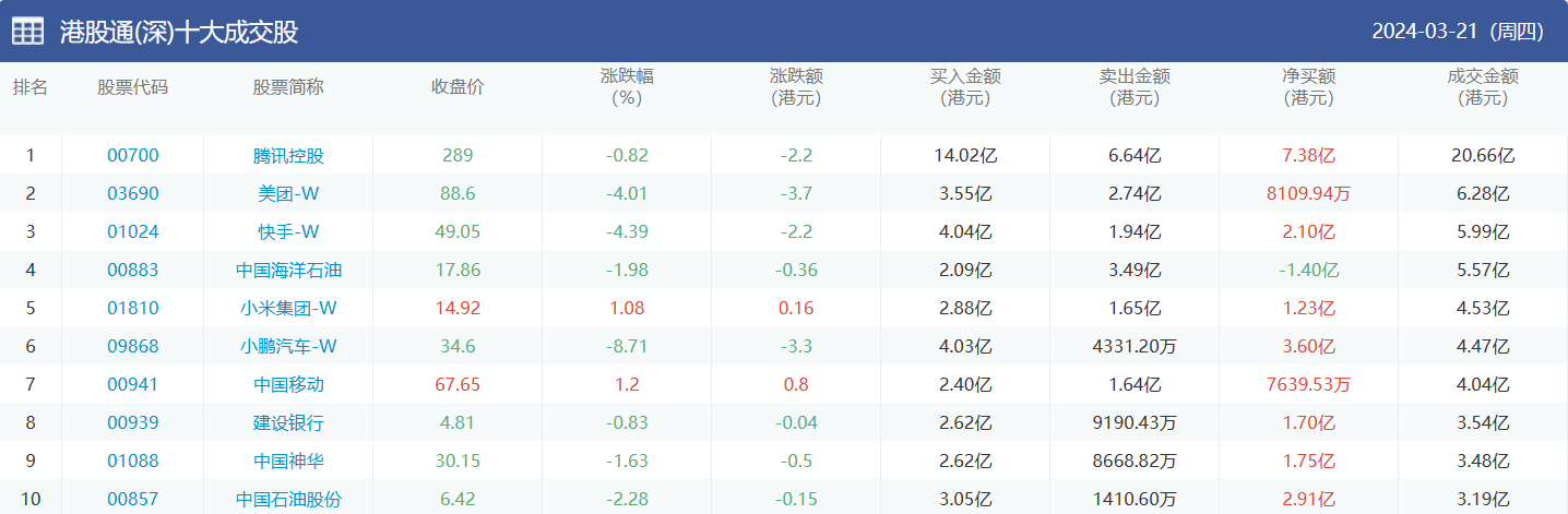 亚汇网实时数据统计:截至3月22日收盘腾讯控股、建设银行、美团-w位居港股通(沪)成交前三,腾讯控股、美团-w、快手-w位居股通(深)成交前三。