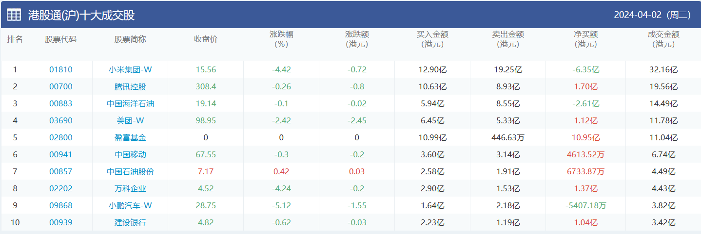 亚汇网实时数据统计:截至4月3日收盘小米集团-w、腾讯控股、中国海洋石油位居港股通(沪)成交前三,小米集团-w、腾讯控股、中国海洋石油位居股通(深)成交前三。