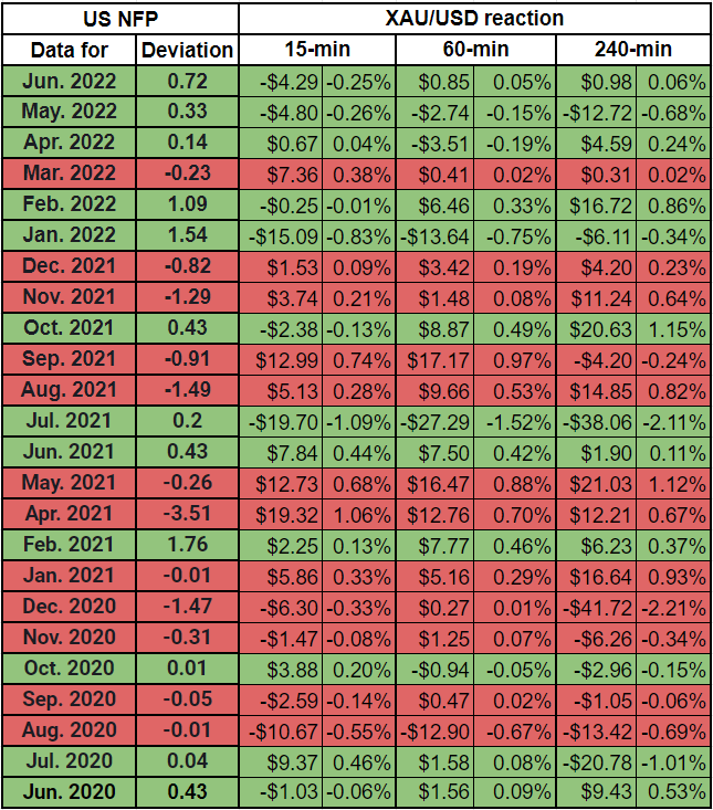 从历史上看,美国就业报告对黄金估值的影响有多大?在本文中,我们展示了一项研究的结果,在该研究中,我们分析了黄金/美元对之前24个非农数据的反应*。 在美国劳工统计局(L)准备于8月5日(周五)发布7月份就业报告之际,我们公布了我们的调查结果。预期非农就业人数继6月增加37.2万人后,将增加25万人。 *我们省略了2021
