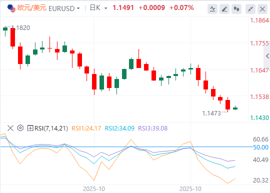 周一亚盘,美元指数窄幅上涨,上周五,日元兑美元汇率录得月度下跌,主要因日本央行在加息立场上未如市场预期般强硬,同时美联储也抑制了12月降息的预期,共同助推美元走强。与此同时,美元指数延续涨势,创下自7月以来的最佳月度表现。市场对美联储12月降息的预期已显著降温,交易员目前预计降息概率为63%,远低于一周