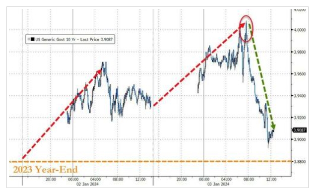 当地时间周三交易时段,素有“全球资产定价之锚”之称的10年期美国公债收益率一度攀升至4%以上,随后有所回落。投资者正仔细研判最新经济数据和美联储12月货币政策会议的纪要,以判断美国经济是否能实现软着陆。 10年期美债收益率在12月曾一度跌至六个月最低,因美国通胀呈现持续降温迹象,且美联储明确发出了其自1980