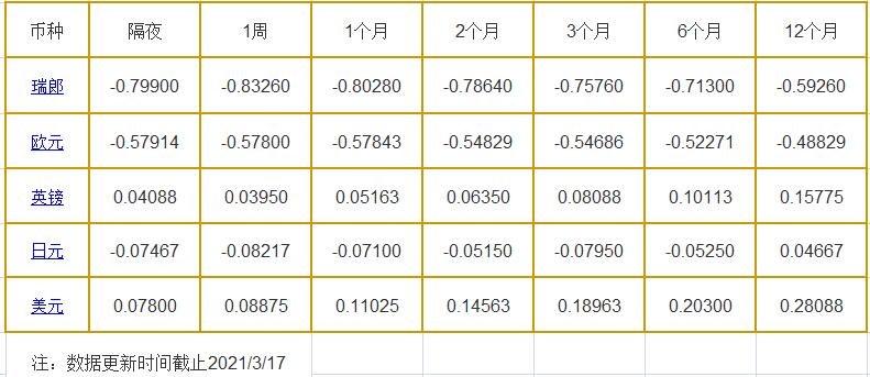 1个月LIBOR:瑞郎报-0.80280%,欧元报-0.57843%,英镑报0.05163%,日元报-0.07100%,美元报0.11025%。