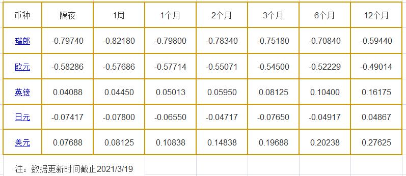 1个月LIBOR:瑞郎报-0.79800%,欧元报-0.57714%,英镑报0.05013%,日元报-0.06550%,美元报0.10838%。