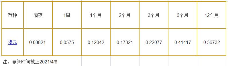 4月9日香港银行间同业拆借利率港币: