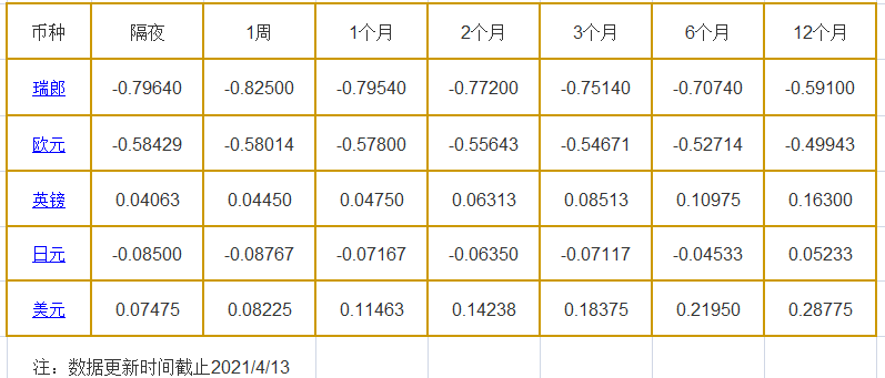 1个月LIBOR:瑞郎报-0.79540%,欧元报-0.57800%,英镑报0.04750%,日元报-0.07167%,美元报0.11463%。