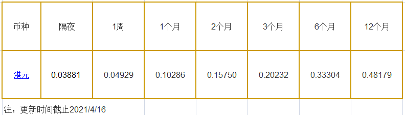 4月16日香港银行间同业拆借利率港币: