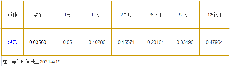 4月19日香港银行间同业拆借利率港币: