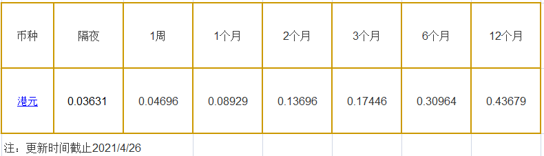 4月26日香港银行间同业拆借利率港币: