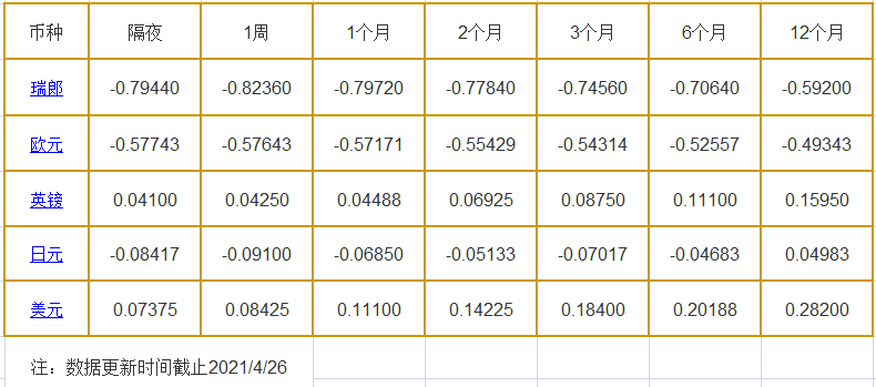 1周LIBOR: 瑞郎报-0.82360%,欧元报-0.57643%,英镑报0.04250%,日元报-0.09100%,美元报0.08425%;
