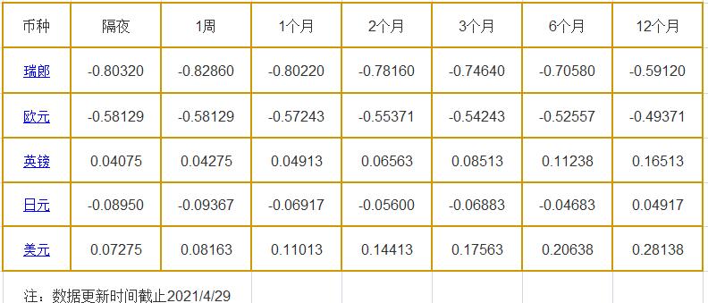 1个月LIBOR:瑞郎报-0.80220%,欧元报-0.57243%,英镑报0.04913%,日元报-0.06917%,美元报0.11013%。