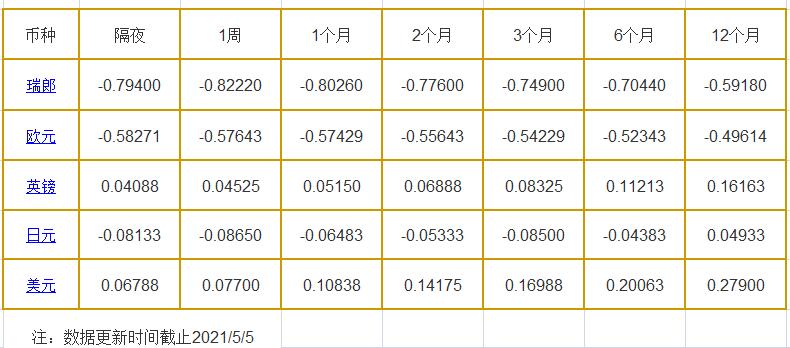 1个月LIBOR:瑞郎报-0.80260%,欧元报-0.57429%,英镑报0.05150%,日元报-0.06483%,美元报0.10563%。