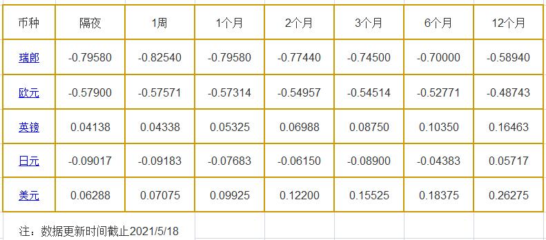 隔夜LIBOR:瑞郎报-0.79580%,欧元报-0.57900%,英镑报0.04138%,日元报-0.09017%,美元报0.06288%;