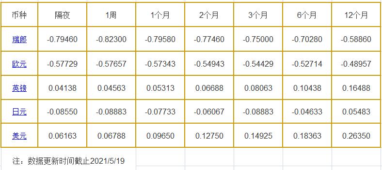 隔夜LIBOR:瑞郎报-0.79460%,欧元报-0.57729%,英镑报0.04138%,日元报-0.08550%,美元报0.06163%;