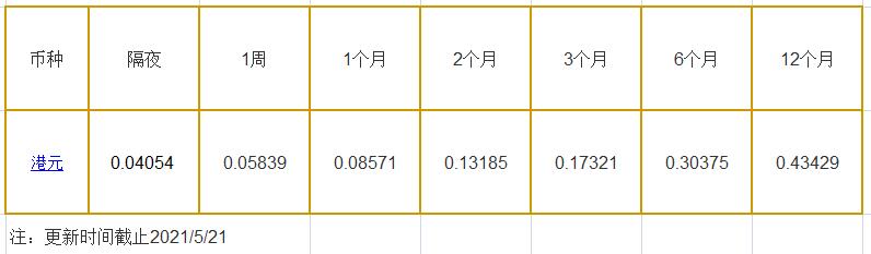 5月21日香港银行间同业拆借利率港币: