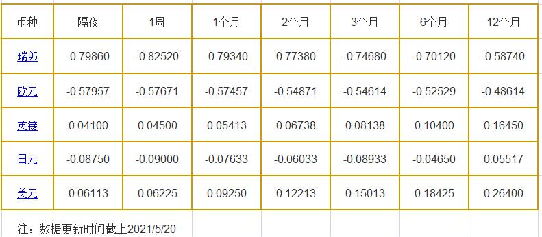 隔夜LIBOR:瑞郎报-0.79860%,欧元报-0.57957%,英镑报0.04100%,日元报-0.08750%,美元报0.06113%;