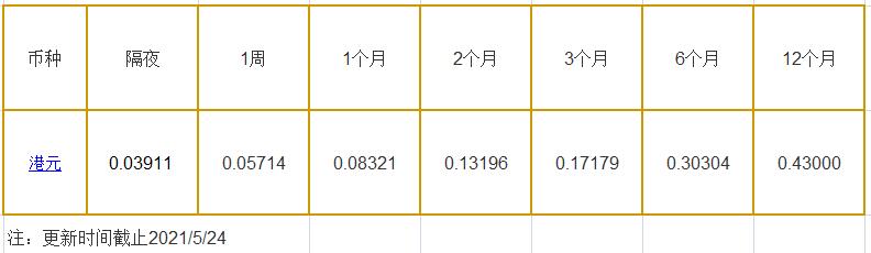 5月24日香港银行间同业拆借利率港币: