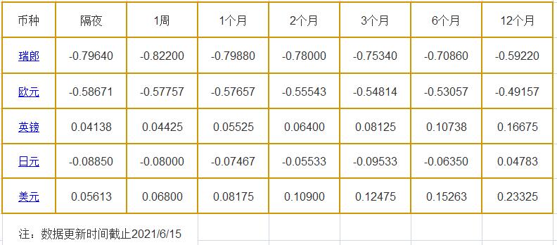 1个月LIBOR:瑞郎报-0.79880%,欧元报-0.57657%,英镑报0.05525%,日元报-0.07467%,美元报0.08175%。