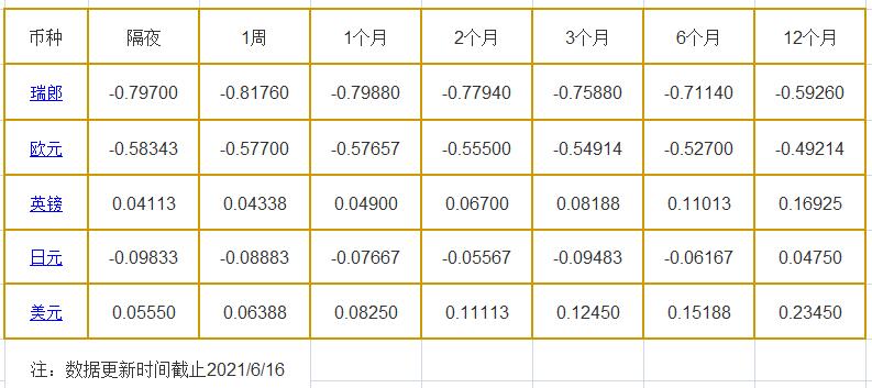 隔夜LIBOR:瑞郎报-0.79700%,欧元报-0.58343%,英镑报0.04113%,日元报-0.09833%,美元报0.05550%;