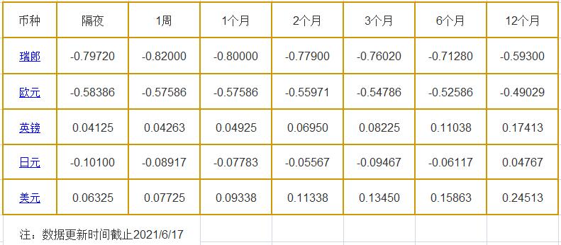 隔夜LIBOR:瑞郎报-0.79720%,欧元报-0.58386%,英镑报0.04125%,日元报-0.10100%,美元报0.06325%;