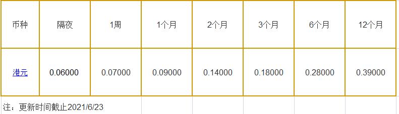 6月23日香港银行间同业拆借利率港币: