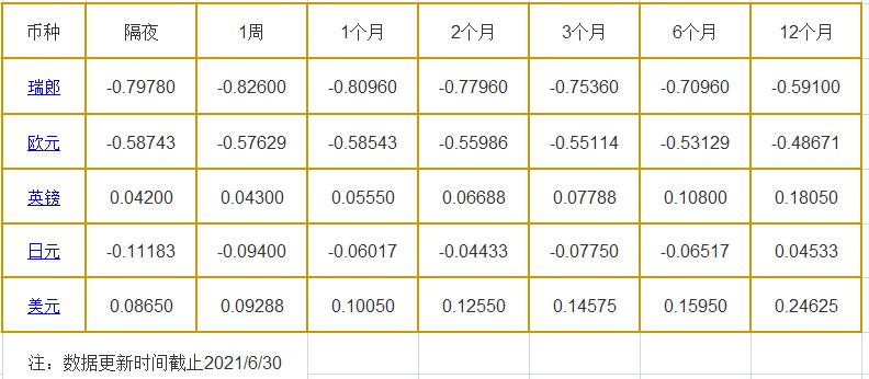 隔夜LIBOR:瑞郎报-0.79780%,欧元报-0.58743%,英镑报0.04200%,日元报-0.11183%,美元报0.0865%;