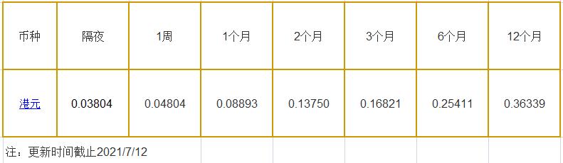 7月12日香港银行间同业拆借利率港币: