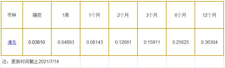 7月14日香港银行间同业拆借利率港币: