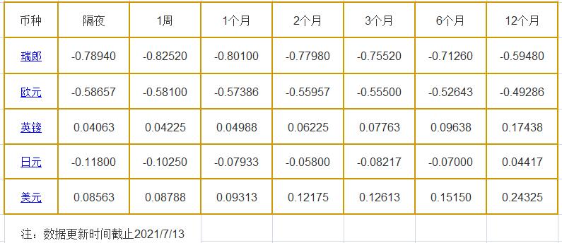 1周LIBOR: 瑞郎报-0.82520%,欧元报-0.58100%,英镑报0.04225%,日元报-0.10250%,美元报0.08788%;