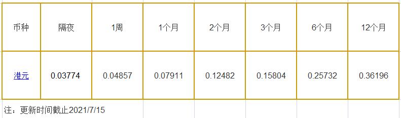 7月15日香港银行间同业拆借利率港币:
