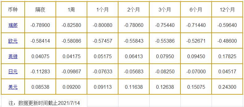 1周LIBOR: 瑞郎报-0.82580%,欧元报-0.58086%,英镑报0.04175%,日元报-0.09867%,美元报0.09200%;