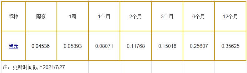 7月27日香港银行间同业拆借利率港币: