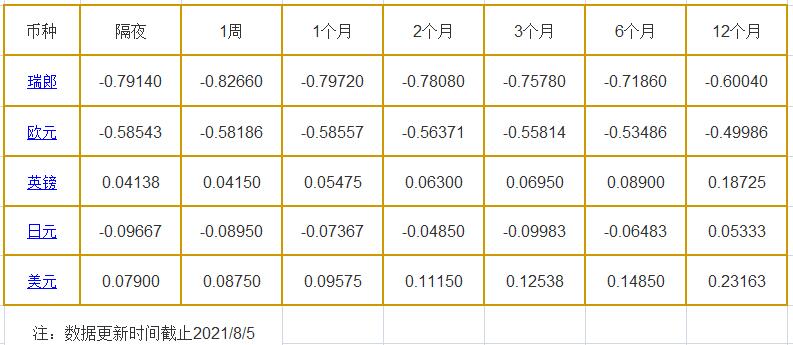 隔夜LIBOR:瑞郎报-0.79140%,欧元报-0.58543%,英镑报0.04138%,日元报-0.09667%,美元报0.07900%;