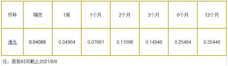 今日香港银行同业拆借利率(HIBOR)(2021年8月9日)