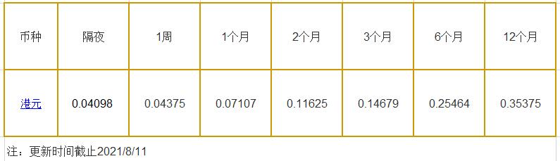 8月11日香港银行间同业拆借利率港币: