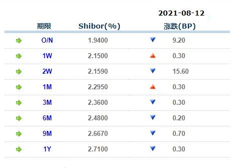 今日上海银行间同业拆放利率 (Shibor)(2021年8月12日)
