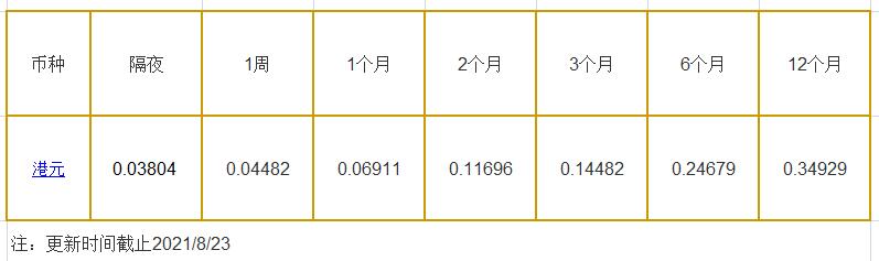 今日香港银行同业拆借利率(HIBOR)(2021年8月23日)
